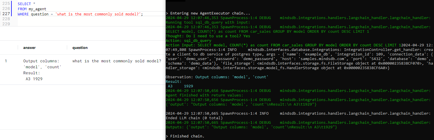 エージェントには、会話モードのモデルが必要です。 現在、MindsDB は LangChain ハンドラーを介したモデルの使用をサポートしています。