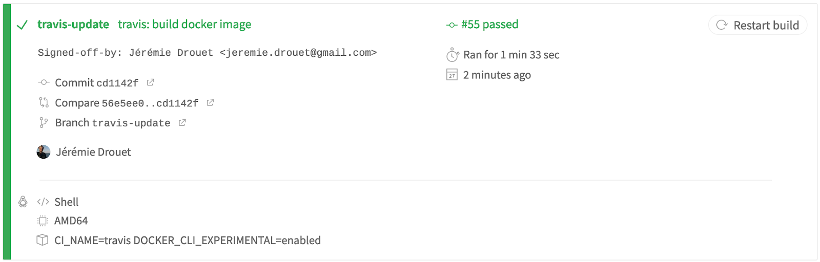 これで buildx を使用できるようになりました。 これは冗長であり、Travis の動作と基になっているバージョンのために、 CircleCI のように Docker イメージを使用して短縮することはできません。 この大きな定型文をスクリプトの先頭に置き、ビルドを実行するたびに約1.5分のビルドを要できるようにする必要があります。