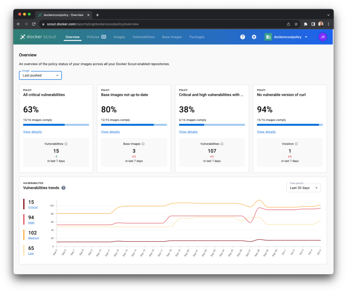 Docker Scout はデフォルトですべてのローカル イメージを分析しますが、リモート リポジトリ内のイメージを分析するには、Docker Scout イメージ分析を有効にする必要があります。 これは、Docker Hub、Docker Scout ダッシュボード、および CLI から実行できます。 概要ガイドでその方法をご覧ください。