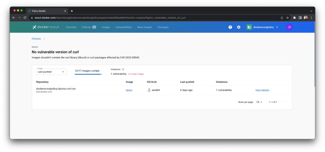 結果のリストには、このポリシーに違反するすべての画像が含まれています — つまり、上記の重大度の高い CVE (CVE-2023-38545) の影響を受けやすいバージョンの curl が含まれています。