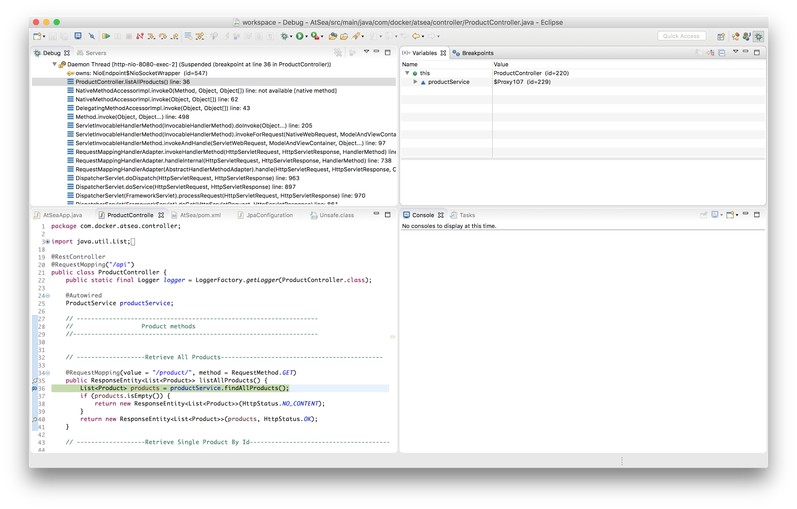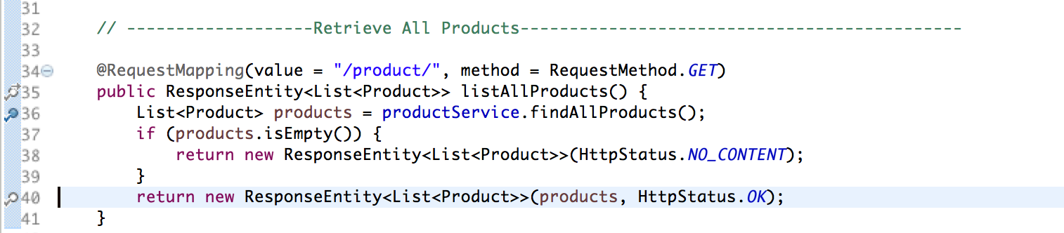 リモート デバッグをテストするには.java製品の一覧を返す ProductController にブレークポイントを設定します。