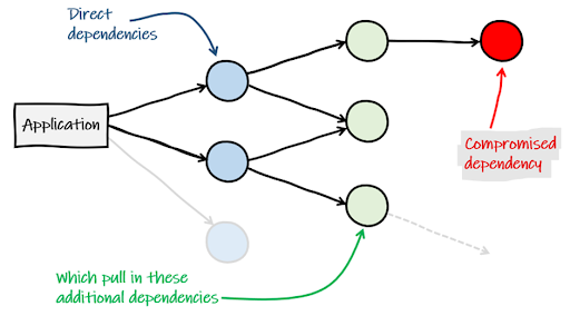 これらの問題は、推移的な依存関係のチェーンの奥深くに存在する可能性があることを覚えておくことが重要です。 上の図では、攻撃者が依存関係、依存関係、依存関係を標的にしていることがわかります。 このネスティングにより、エコシステムは管理不能になり、監査が困難になります。