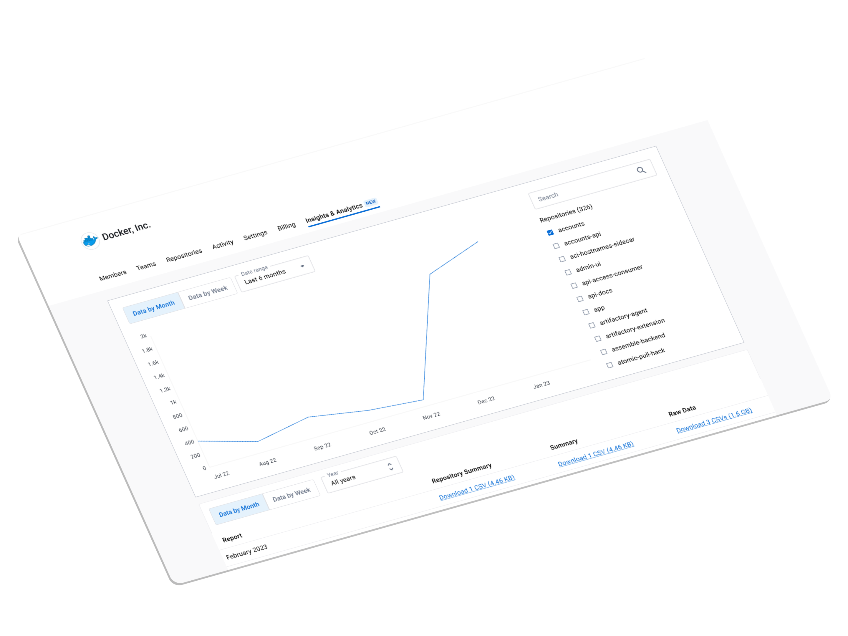 The analytics feature on Docker Hub offers a robust API and dashboard for in-depth product insights, to help you understand your distribution, identify usage patterns, and grow your business.